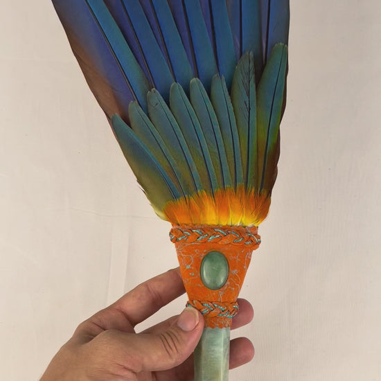 Macaw & Parakeet Smudge Fan Amazonite & Aventurine Handle | Orange Leather Wrap