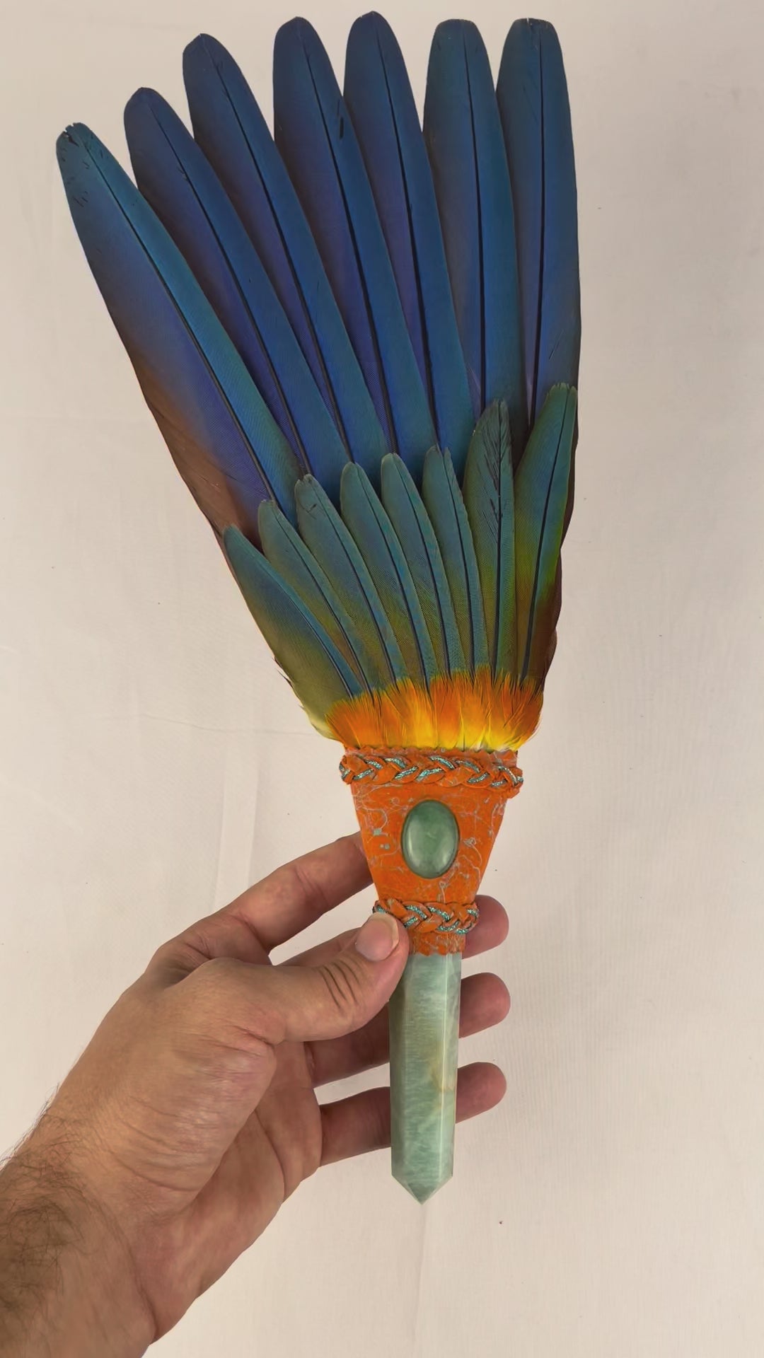 Handcrafted in prayer and respect for Native traditions, this traditional smudge fan features macaw feathers for vision and truth, parakeet feathers for joy and communication, and an amazonite stone handle wrapped in orange leather symbolizing courage, vitality, and sacred fire.
