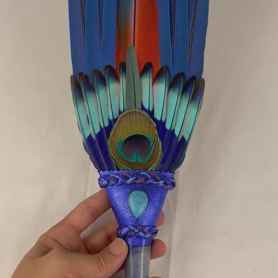Macaw and blue Indian roller feathers carry messages of clarity, vision, and joy. The handle, carved from blue aventurine and wrapped in soft leather, grounds the energy, while a howlite cabochon in turquoise form brings peace and divine protection.